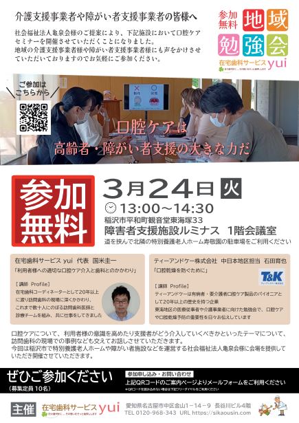 地域勉強会(口腔ケアセミナー)を主催するのは2009年の創業以来、地域の歯科医院とともに在宅歯科サービスを展開し、在宅を中心に訪問歯科の現場に深くかかわり続けてきた 在宅歯科サービス yui です。
